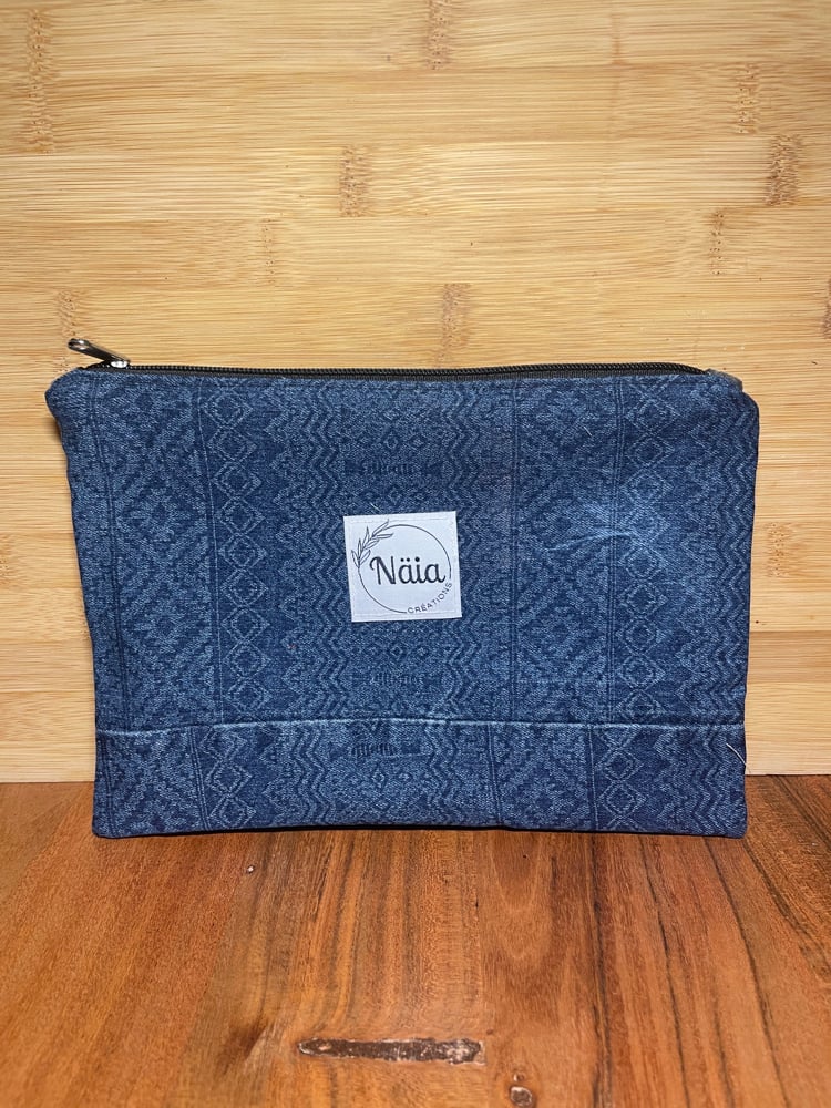 Pochette plate en jeans aztèque et tissus gris.