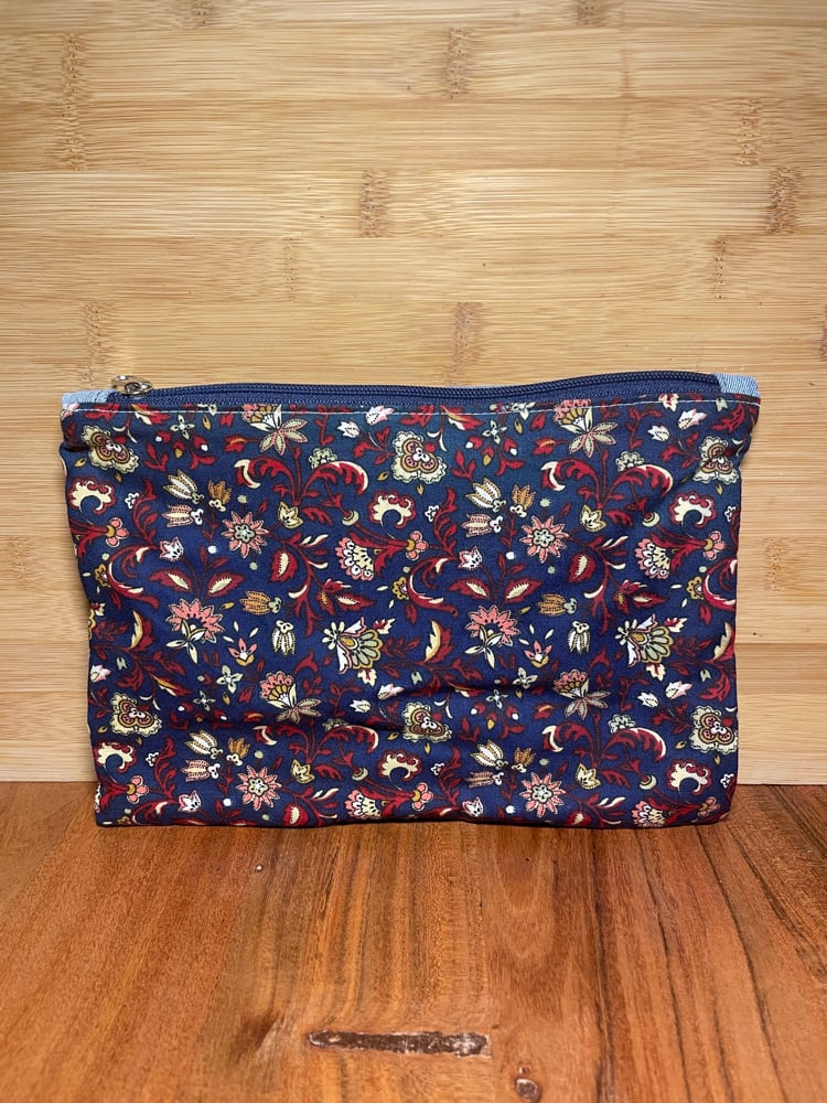 Pochette plate en jeans et tissus fleuri.